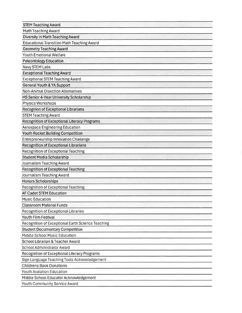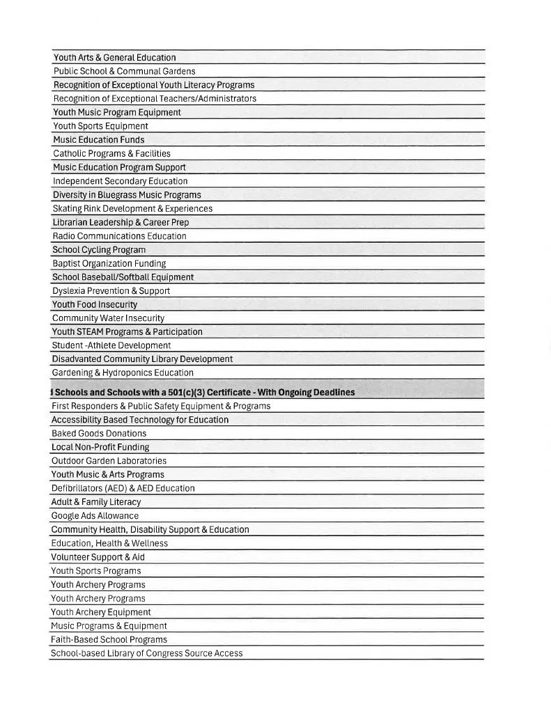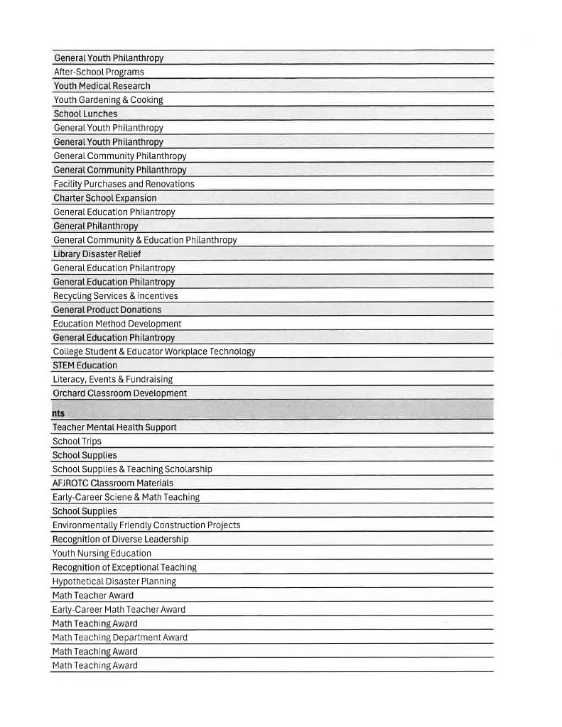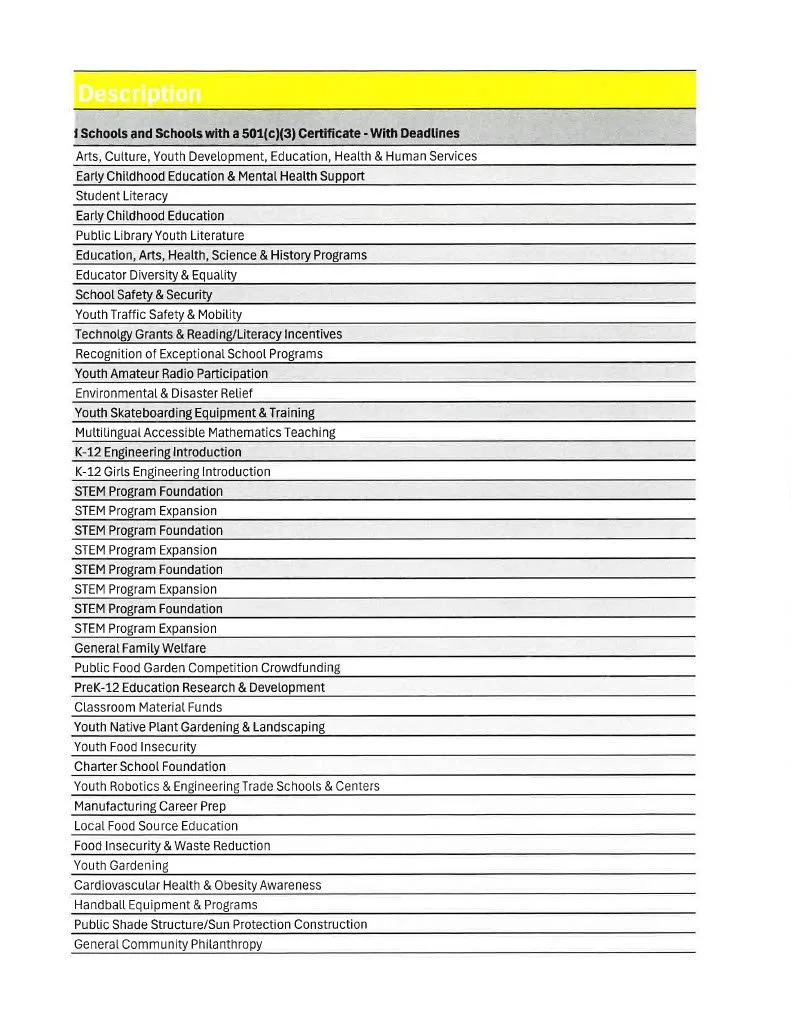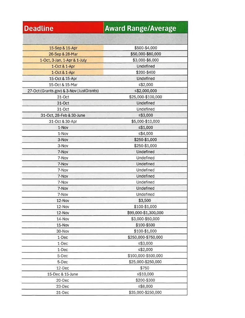 Education Grant Spreadsheet: Catalogued a plethora of openly applicable education related grants with grants broken into three categories, featuring descriptions of each grant, application deadlines, award amounts/averages/ranges, hyperlinks to each application, sorting functionality and other features not accessible in this format.